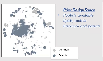 In reality, the most effective regions of this design space may be discontinuous and scattered. Traditional Design of Experiments (DOE) methods can explore only a limited area, often identifying local optima while missing the global best solutions. Historical data from literature and patents shows clusters of lipid designs, as researchers build on one another’s work. Yet large unexplored regions remain, offering untapped potential for innovation.